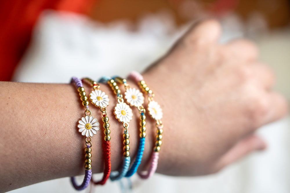 Colorful Cord Bracelet with 24K Gold Plated Beads and White flower