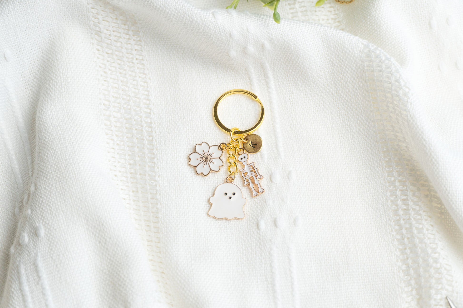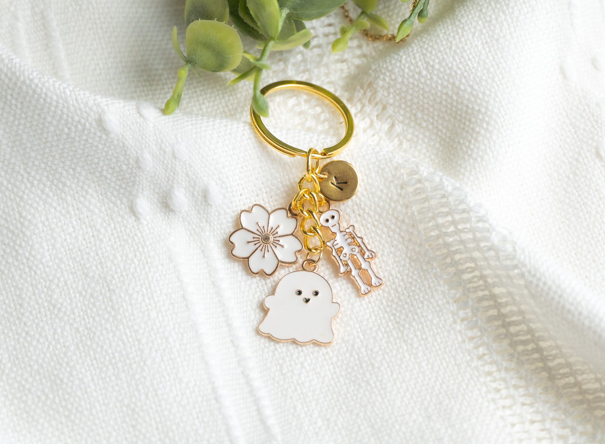 Add a touch of spooky cuteness to your Halloween season with our white ghost keychain! It features a skeleton and flower charm, making it versatile for keys or as a purse or bag charm. Personalize it with a hand stamped initial charm for a perfect gift idea.