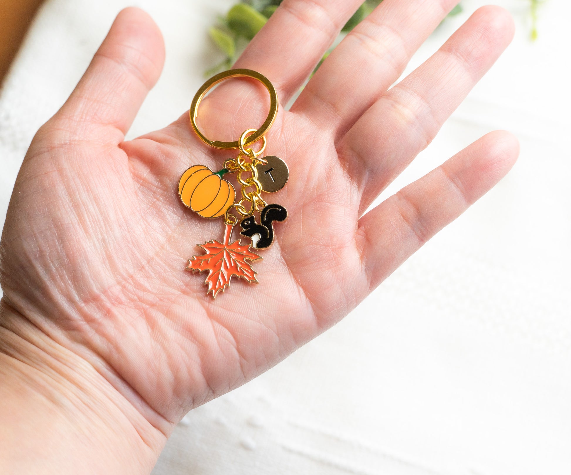 Add a touch of fall to your everyday accessories with our fall themed keychain! Featuring a pumpkin, maple leaf, and squirrel charm, this keychain is perfect for Thanksgiving gatherings, fall birthdays, or for anyone who loves to decorate their bags with aesthetic charms. Customize it with a hand stamped initial for a personalized gift!