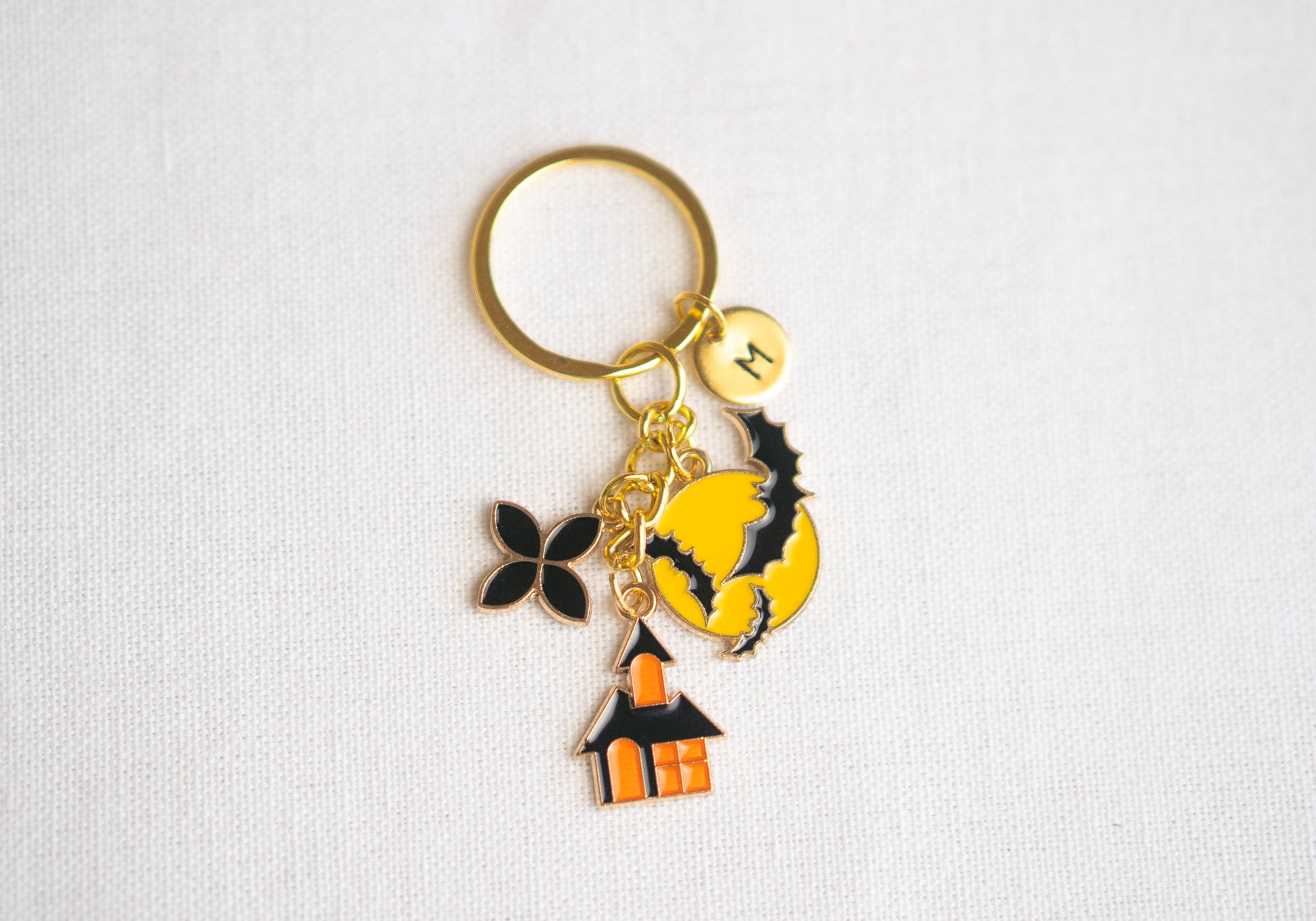 This Halloween haunted house charm keychain is guaranteed to give your keys a spooky twist. Featuring an adorable bat charm and a black flower, this accessory is a must-have for any Halloween enthusiast. It also makes a fantastic gift or a charming addition to your purse. Personalize it with a hand-stamped initial charm of your choosing!