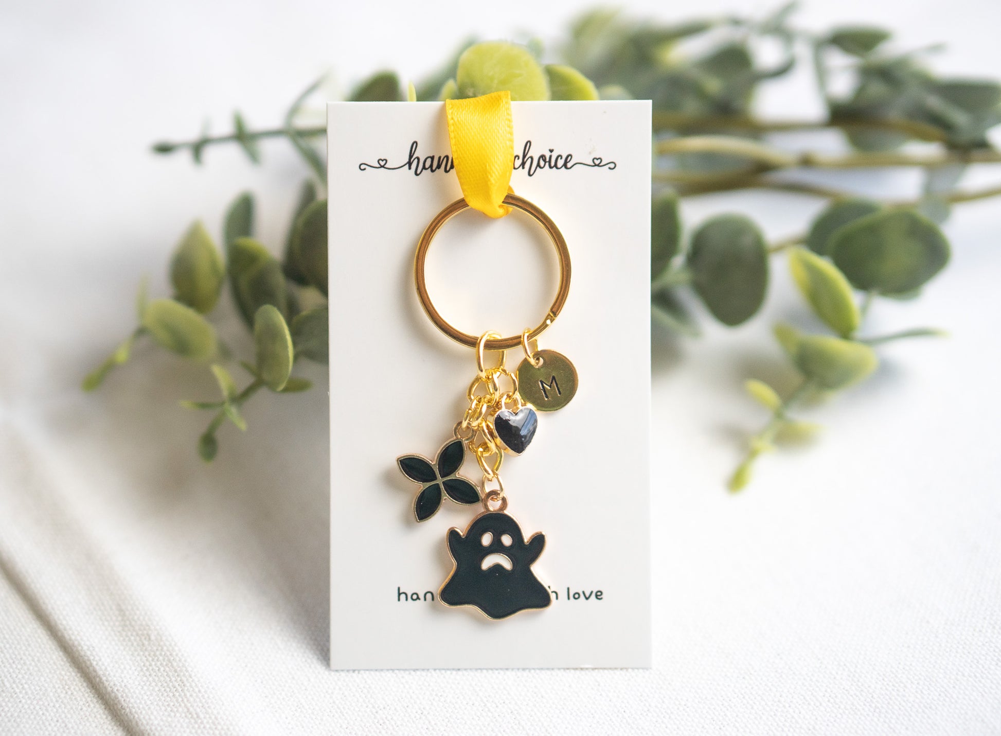Get spooky with this halloween cute keychain featuring a black ghost, heart, and flower. Stand out with this unique keychain and make it even more special by adding someone's initial. Perfect for a personalized gift or to add to your backpack.
