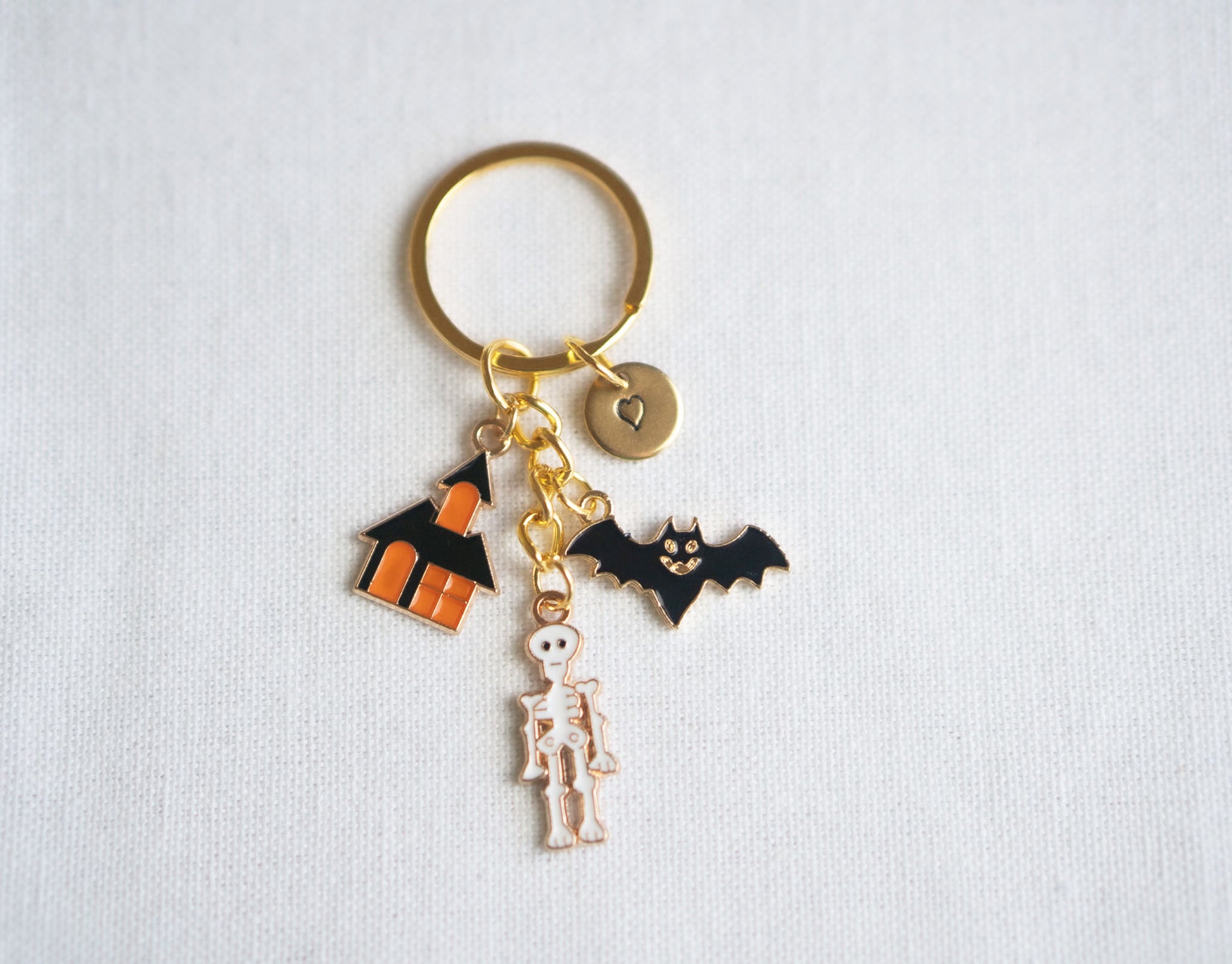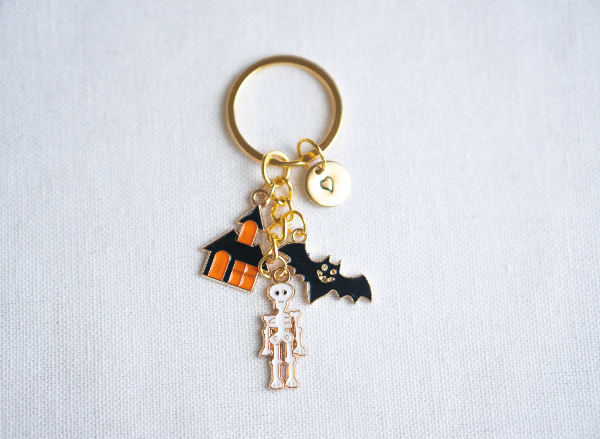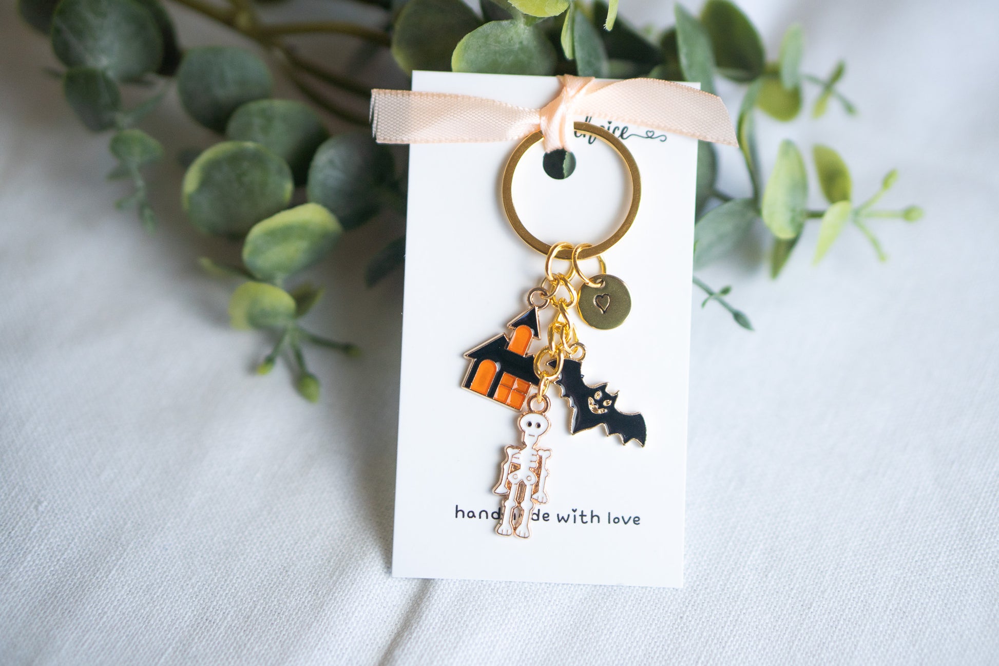 Elevate your Halloween spirit with our must-have keychain! Featuring a spooky skeleton and bat charm, paired with a charming haunted house and a personalized hand stamped initial charm. A perfect gift for friends, sisters, and coworkers, this cute keychain will surely add some Halloween fun to any set of keys!