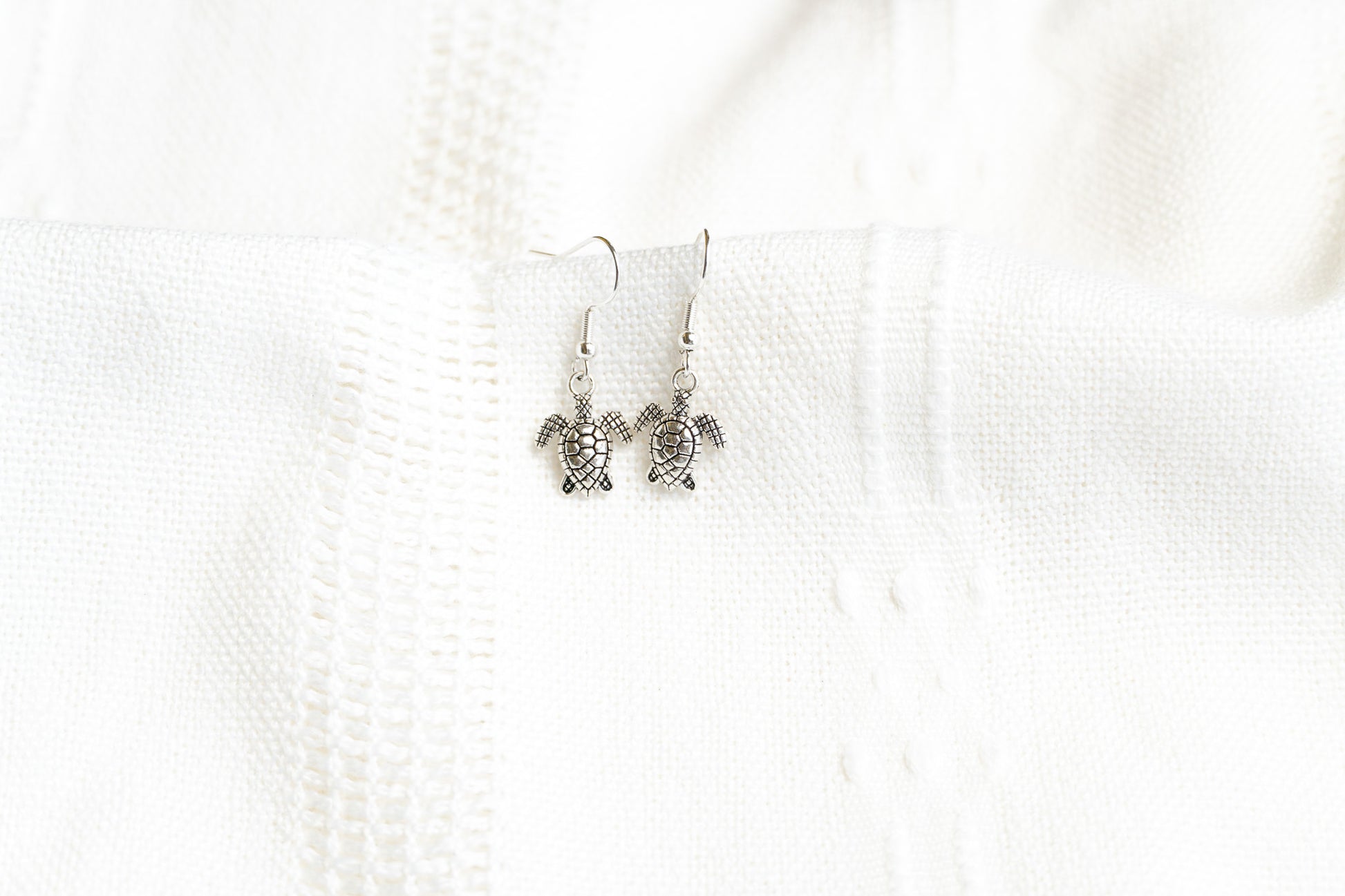 These small turtle dangle earrings showcase antique silver-colored charms delicately hanging from sterling silver plated wire, offering a refined accessory perfect for any turtle lover.
